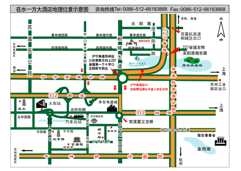 1.苏嘉杭高速南通方向往苏州(G15W)→在相城区出口处下→在太阳路(往西开及左转)→到第二个路口左转弯→到澄阳路(开到底(顺着路走可到本酒店)2、上海、昆山方向: