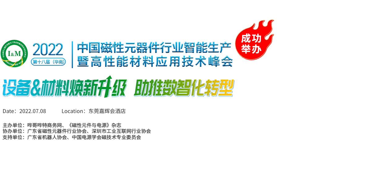 7月8日,由哔哥哔特商务网、《磁性元件与电源》杂志主办;广东省磁性元器件行业协会、深圳市工业互联网行业协会协办;广东省机器人协会、中国电源学会磁技术专委会支持举办的2022第十八届(华南)中国磁性元器件行业智能生产暨高性能材料应用技术峰会成功举办。