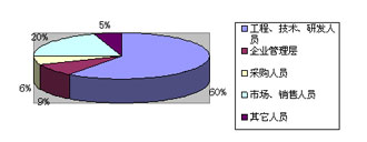 在参会的人员中,以研发、技术人员占60%,其次是企业管理人员占9%;采购人员占6%,市场、销售占20%,其它人员5%。