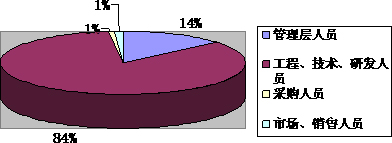在参会的人员中,以研发、技术、开发为主,研发、技术人员占84%,其次是企业管理人员占14%;少部分为市场、销售占1%和采购人员1%