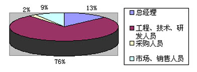 在参会的人员中,以研发、技术、开发为主,研发、技术人员占76%,其次是企业总经理占13%;市场、销售占9%和采购人员占2%