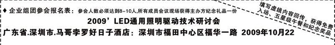 ■参加方式:请将此表填妥后并回传,主办方在10月15日前将会发布参会确认通知函,于10月22日亲赴举办地点办理报名手续后参会并领取相关资料 ■ 咨询专线:020-37880732 叶小姐 ■ 传真专线:020-37880701 E-mail:mg@big-bit.com、kf@big-bit.com ■ 主办方网站:http://ic.big-bit.com/hdbd/liangdian.html ■ 注意事项: 1. 请于10月19日前将参加回执表回复给主办方,以便主办方安排听会席位; 2. 报名确认均以主办方的正式参会通知函为准。 2009’LED通用照明驱动技术研讨会组委会