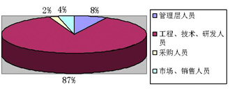 在参会的人员中,以研发、技术、开发为主,研发、技术人员占87%,其次是企业管理人员占7.5%;少部分为市场、销售占3.3%和采购人员2%