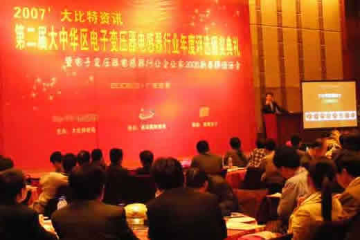 2007’大比特资讯第二届大中华区电子变压器电感器行业年度评选颁奖典礼,得到了华为、中兴、欧司朗、飞利浦、康舒电子、TCL和雷士照明等一批具有代表性的整机企业的认可和欢迎,并作为特邀颁奖嘉宾参与了奖项揭晓。