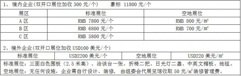 标准展位 USD2200美元/个 空地展位 USD220美元/㎡