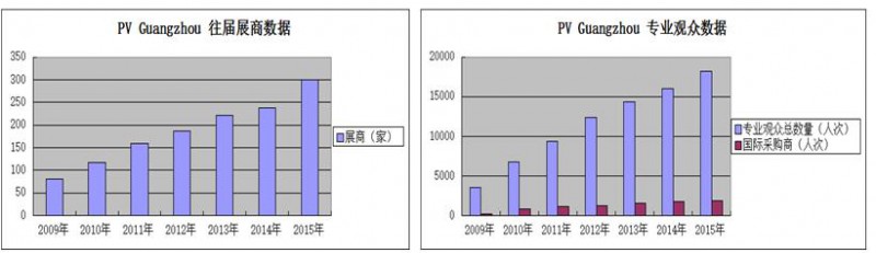 PV Guangzhou已连续举办7年,是全球光伏企业促进贸易、推广品牌的重要展览平台。展示内容覆盖光伏产业各个领域,包括原料供应、主辅材料、机械设备、光伏电池、光伏组件、光伏工程及光伏应用产品。每年连同风能、生物能等新能源领域联袂展出,累计展览面积达到20万平方米,吸引了1000多家国内外企业的参与,得到了国内外300多家媒体的宣传推广,展会为中国企业走出去、海外企业引进来建立了良好的商贸服务平台。PV Guangzhou高度重视观众组织工作,得到了8万多名专业观众的支持,其中上届展会到会观众达到18216人次,国际采购商再创新高,达到1916人次。