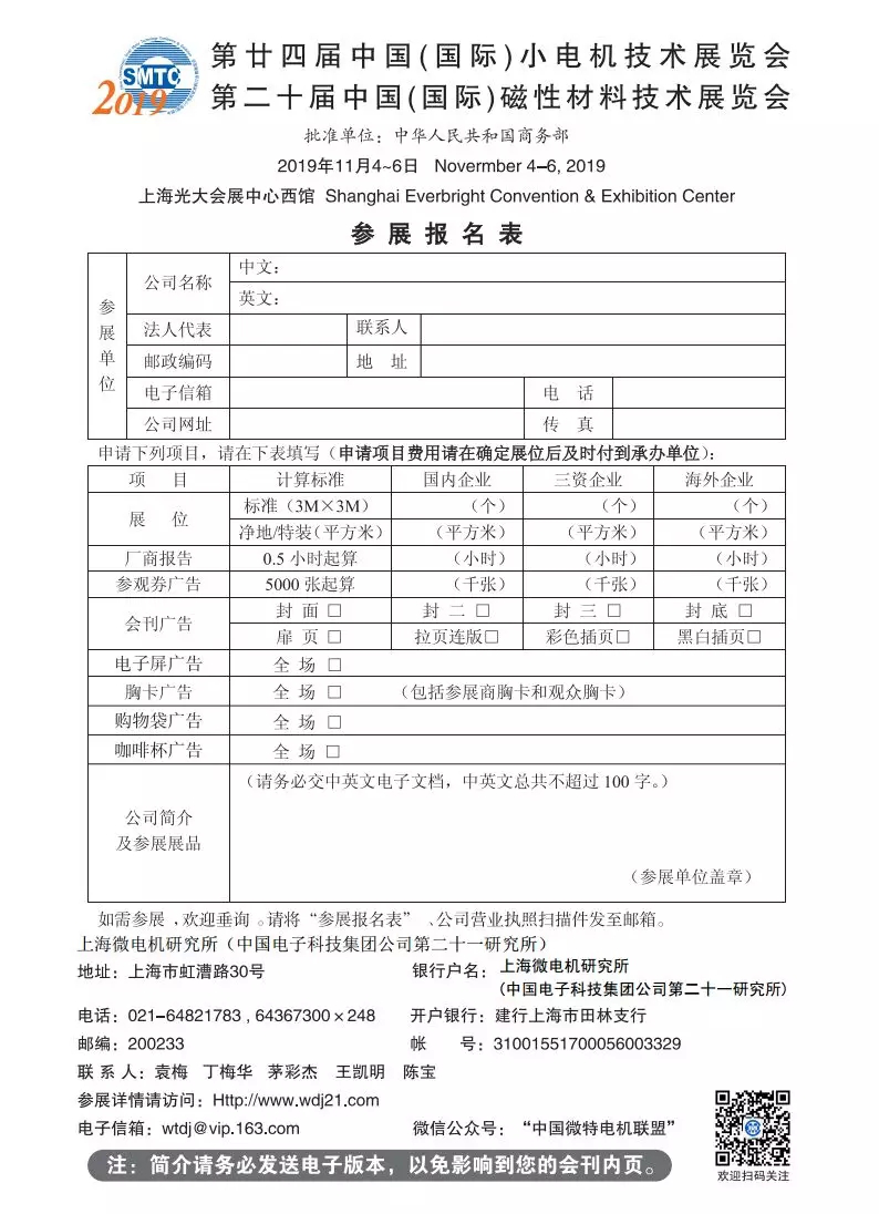 2019第二十四届中国(国际)小电机技术研讨会暨展览会、第二十届中国(国际)磁性材料技术展览会将于2019年11月4日~6日在上海光大会展中心举办,预设标准展位800个,展览面积18000平方米。热忱欢迎中外企业及采购团体、专家、学者前来中国上海参展、参观、合作洽谈,共谋发展大计。