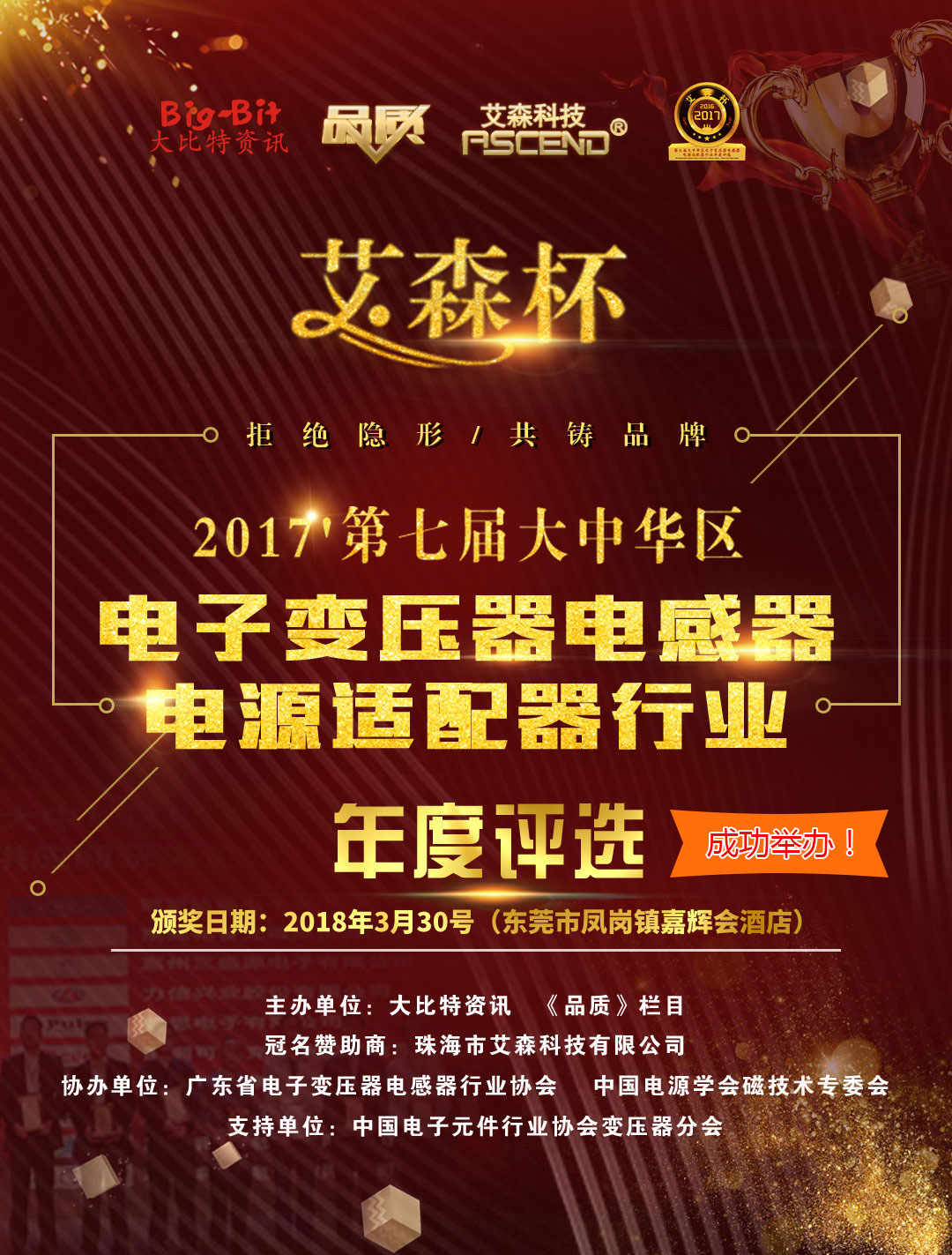 3月30日,“艾森杯2017第七届大中华区电子变压器电感器电源适配器行业评选颁奖盛典”在东莞嘉辉会酒店正式落下帷幕...【详情】