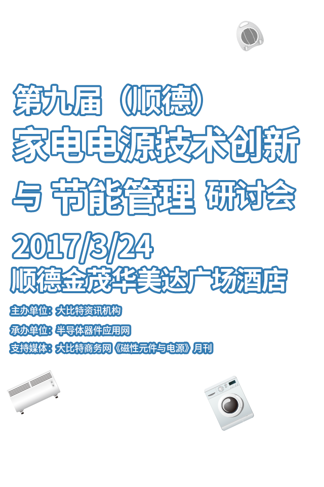 3月24日,以“创新·节能”为主题的“第九届(顺德)家电电源技术创新与节能管理研讨会”在广东省顺德市金茂华美达广场酒店隆重举行。本次会议由大比特资讯主办、半导体器件网承办,集聚精彩的技术演讲和产品方案的展示。