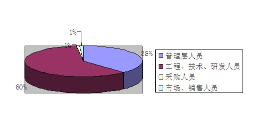 在参会的人员中,以研发、技术、开发为主,研发、技术人员占60%,其次是企业管理人员占38%;市场、销售占1%和采购人员占1%;