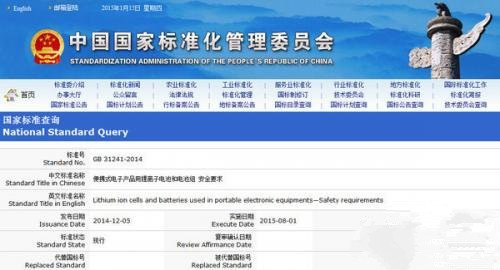 2014年12月5日,我国首部锂离子电池强制标准《便携式电子产品用锂离子电池和电池组安全要求》正式发布,标准号为GB 31241-2014。由于该标准适用于移动电源内部的锂离子电池元件,因此被各大媒体报道为“首个移动电源国标”。可惜在大家兴高采烈之时,工信部澄清 “移动电源国标”实属误读。