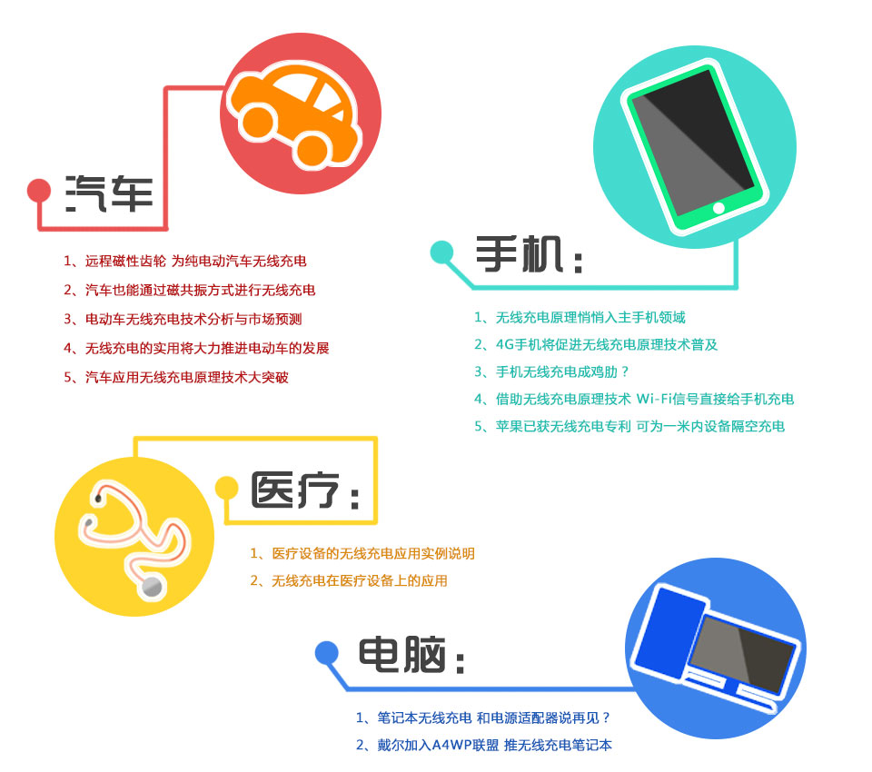 无线充电技术,完全不借助电线而仅仅利用磁铁为一个或以上的设备充电,这项技术允许设备在距离充电器最远可达几米远的地方进行无线充电。它应用所有你可以想象得到和想象不到的领域。首先是,低功率低能耗的电子通讯产品,办公产品,如:手机、掌上电脑等利用;其次是,家具产品和低能耗的家电利用,还有其他例如医疗、汽车领域等等;到目前为止,主流的无线充电标准有三种:Qi标准、PMA标准、A4WP标准。但由于这三大标准没有统一,不但给产业用户造成了兼容性难题还提升了普及成本。能不能让这些标准统一起来成为未来无线充电技术能否获得广泛普及的关键因素。